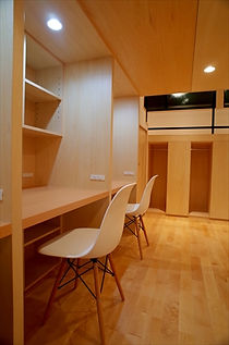 面積的にも3つの個室を設けるとなると、一人当たりのスペースがかなり狭くなります。そしてなによりも採光が取りづらいため、1室を3人で共有することに。
